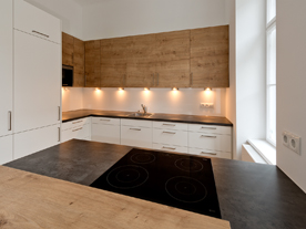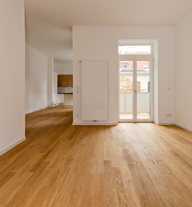 Südseitiges Wohnen mit offener, moderner Küche, Essbereich und Wohnzimmer mit Ausgang zur Loggia.